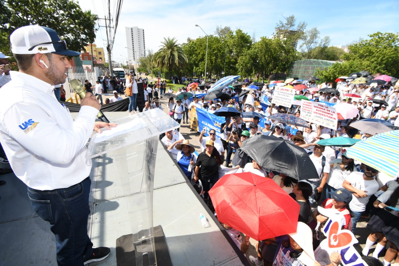 Posterior a la marcha que congregó a la comunidad universitaria en los 20 municipios del Estado, y desde un templete ubicado a las afueras del Polideportivo, donde se concentraron los universitarios con consignas en contra del Gobierno de Sinaloa y en respaldo al rector, Tostado Ramírez, quien también estuvo acompañado de funcionarios de la administración y dirigentes sindicales como José Carlos Aceves Tamayo, que encabeza la sección académica del SUNTUAS, mostrando su apoyo absoluto e irrestricto al dirigente universitario.