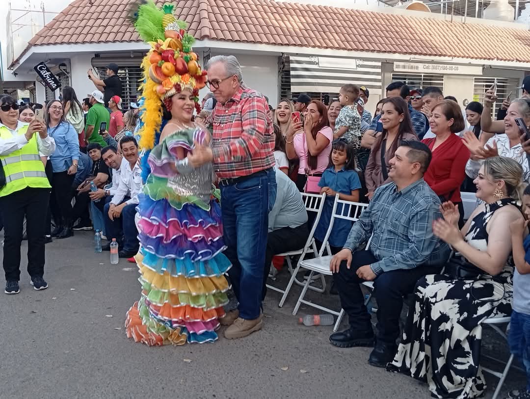 Angostura, Sinaloa 16 de marzo de 2025.-* Al ritmo de “Rumba y Tradición”, el Gobernador Rubén Rocha Moya, acompañado del edil municipal Alberto “El Capy” Rivera y de Anita Gutiérrez Palazuelos, Presidenta del DIF Municipal, presenció el tradicional desfile de las fiestas del Carnaval en Angostura.