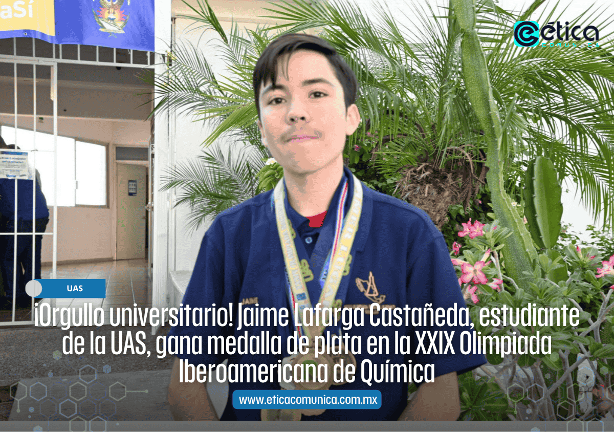 En la Universidad Autónoma de Sinaloa (UAS) todos quienes la conforman abonan para que avance y se transforme; uno de estos universitarios que hace que brille y no solo en el estado, en el país y en el extranjero es el estudiante Jaime Lafarga Castañeda, quien una vez más ha logrado posicionarse entre los mejores al haber obtenido medalla de plata en la XXIX Olimpiada Iberoamericana de Química, celebrada recientemente en la Ciudad de México y Cuernavaca, en la que participaron 38 estudiantes del nivel medio superior provenientes de 13 países.