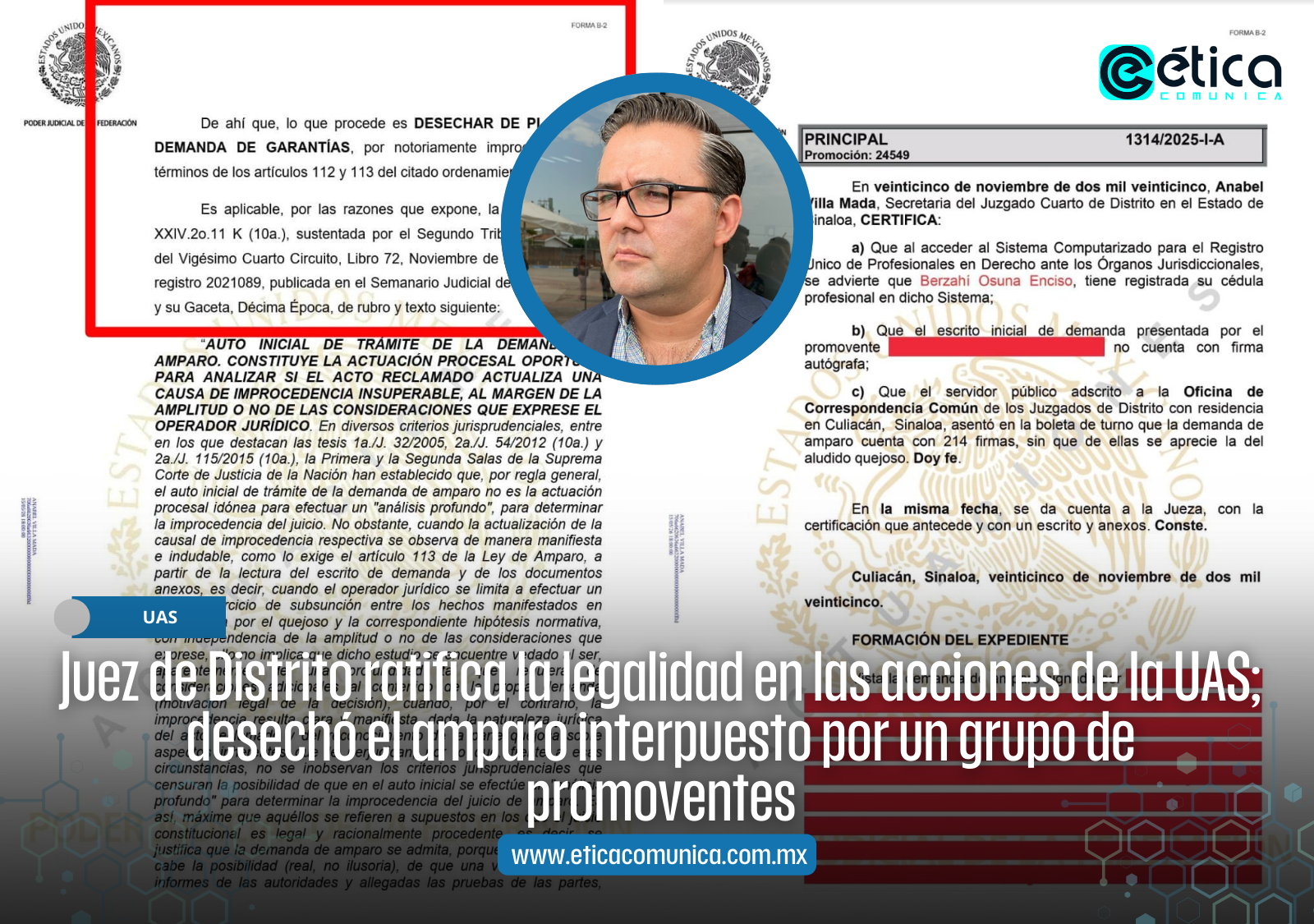 “En este caso concreto, hay un desechamiento de un Juez de Amparo y en lo que se traduce eso, a priori en primer momento, es que los actos llevados a cabo por la Universidad, por la Comisión de Elecciones y Consultas, por el Honorable Consejo Universitario, por el Rector de la Universidad, el doctor Jesús Madueña Molina, y en ejecución de estos actos por parte de la Secretaría General de la Universidad, resulta que todo, todo, es legal, y todo está apegado a derecho, un revés fuerte para esas personas”, expresó Bonilla Rojas.