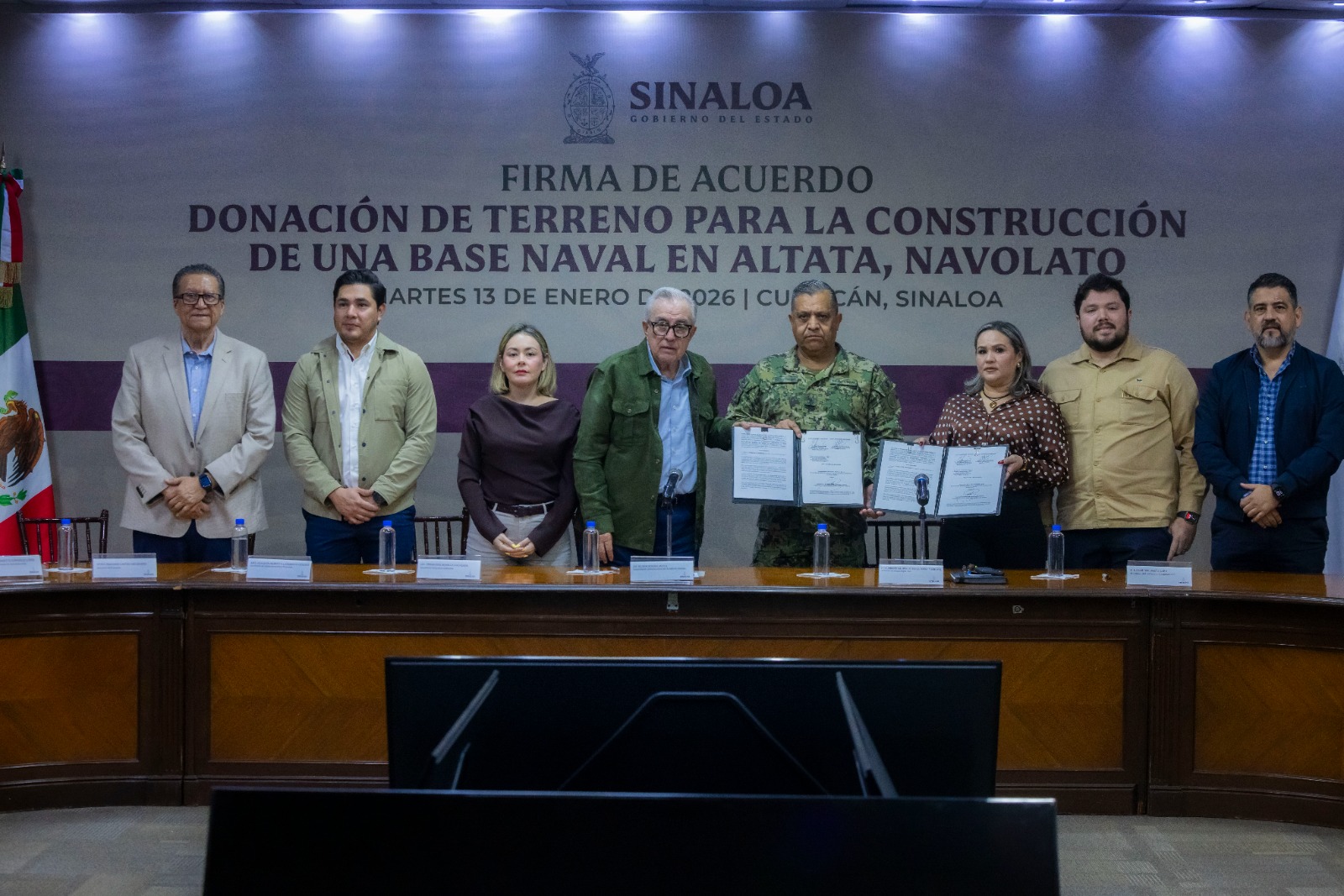 En el Salón de Gobernadores de Palacio de Gobierno se llevó a cabo este acto protocolario de firma de convenio, donde el Gobierno del Estado donó un terreno adicional de 15 hectáreas a la Secretaría de Marina, el cual fue adquirido al Consejo de Administración del Desarrollo de Nuevo Altata, y pagado ahí mismo, predio que viene a sumarse a la primera donación de 10 hectáreas que ya se había concretado para este propósito, de tal manera, que el nuevo Sector Naval tendrá una superficie de 25 hectáreas.