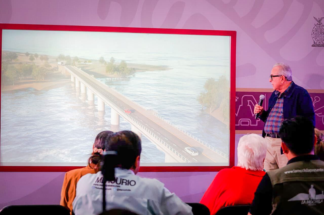 “En pocas palabras, ya está el puente, está el dinero suficiente para pagarlo, no tiene ningún problema, ya los ingenieros están aplicando una tecnología, pues lo más complicado es hacer cómo estos pilares queden debidamente firmes en el agua, pues son 40 metros de profundidad”, retomó el gobernador luego de la explicación técnica que hizo el secretario de Obras.