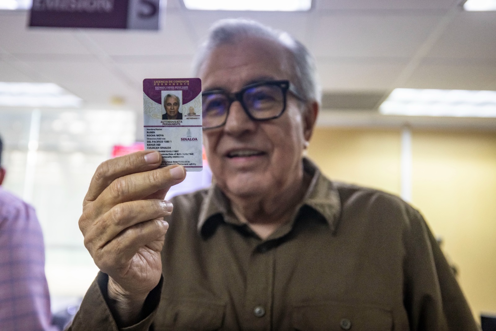 Culiacán, Sinaloa 17 de marzo de 2026.- Invitando a las y los sinaloenses a tramitar la nueva licencia permanente, el gobernador Rubén Rocha Moya, acudió personalmente a las oficinas de Vialidad y Transportes, en la Unidad de Servicios Estatales, para ser uno de los primeros ciudadanos en tramitar su licencia.