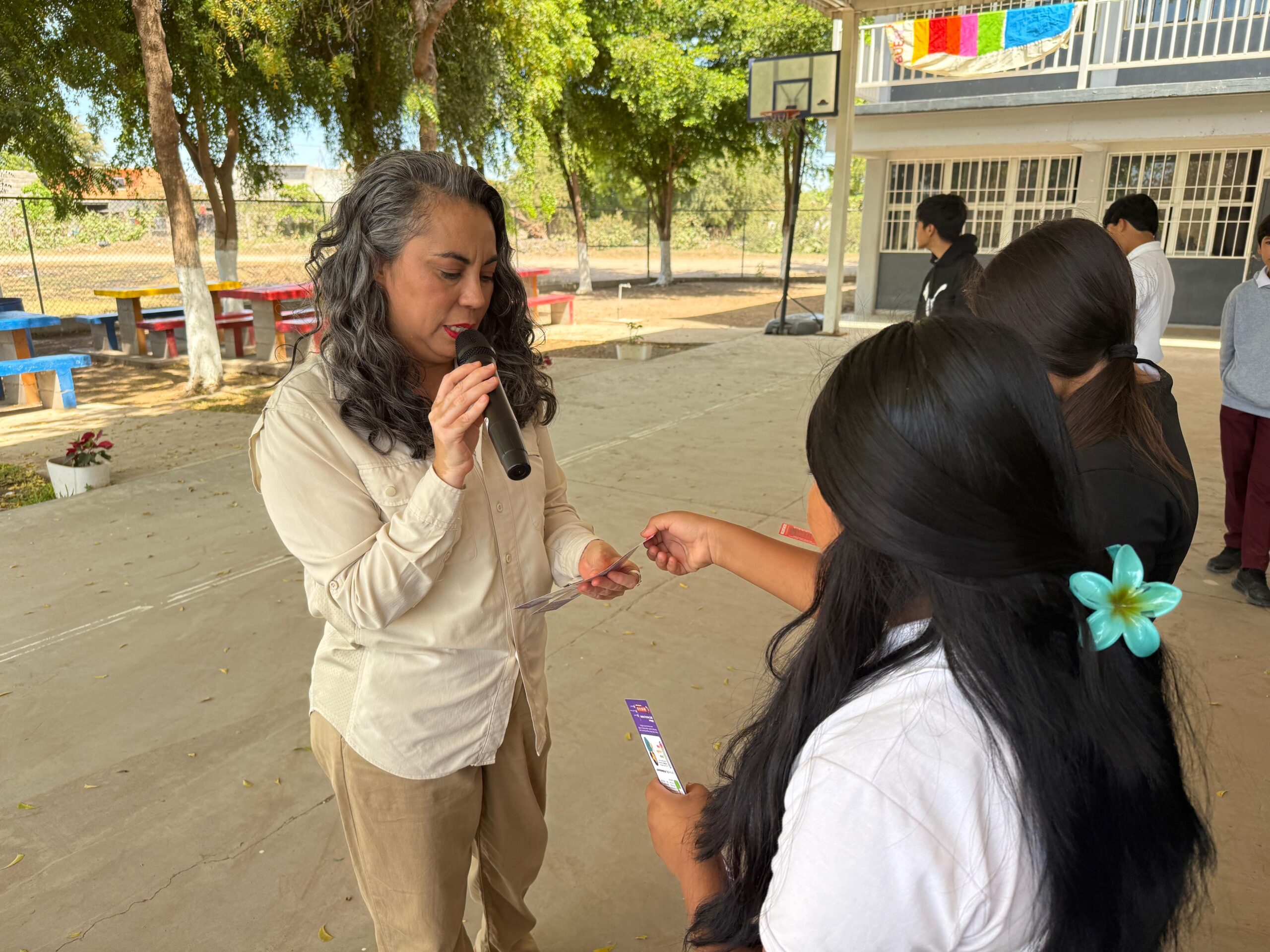 Durante la actividad, la Mtra. Rosa María Gámez Mendívil, Secretaria General Ejecutiva del Consejo Estatal para la Prevención y Atención de la Violencia Familiar (CEPAVIF), sostuvo un diálogo cercano con el alumnado, a quienes explicó la importancia de reconocer las diferentes manifestaciones de violencia y cómo estas pueden escalar si no se identifican y atienden a tiempo.
